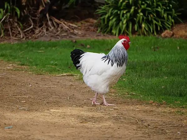 Light Sussex chickens are medium to large-sized birds, with hens typically weighing around 7-8 pounds and roosters reaching 9-10 pounds. Their striking plumage features a snowy white body accented with contrasting black feathers on their neck, tail, and wings.